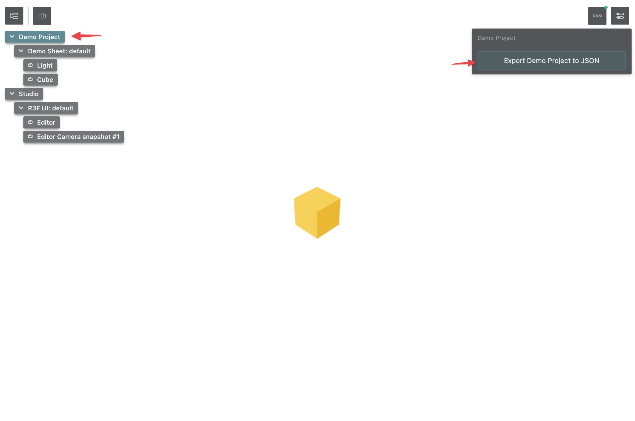 To distribute your animation as a part of your website, export your Theatre.js Project by clicking on "Demo Project" in the outline menu in the top left of the UI, and then click the "Export Demo Project to JSON" button on the right.