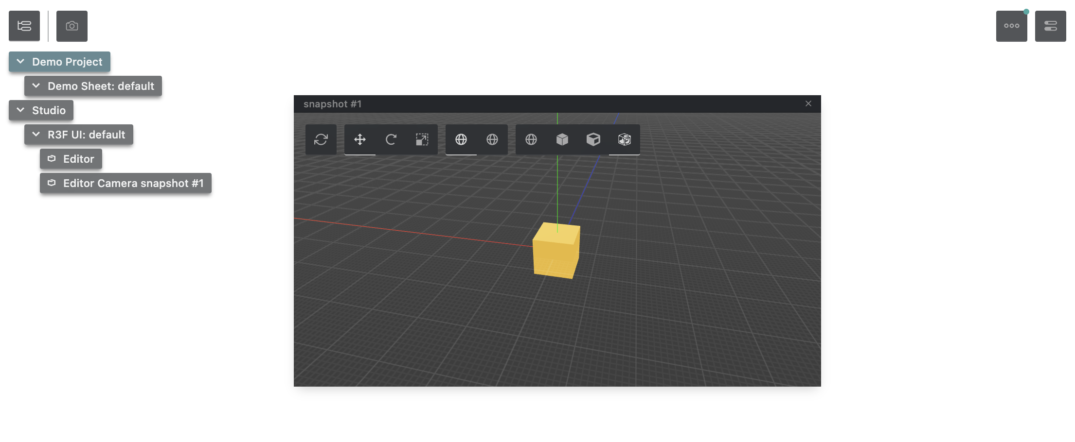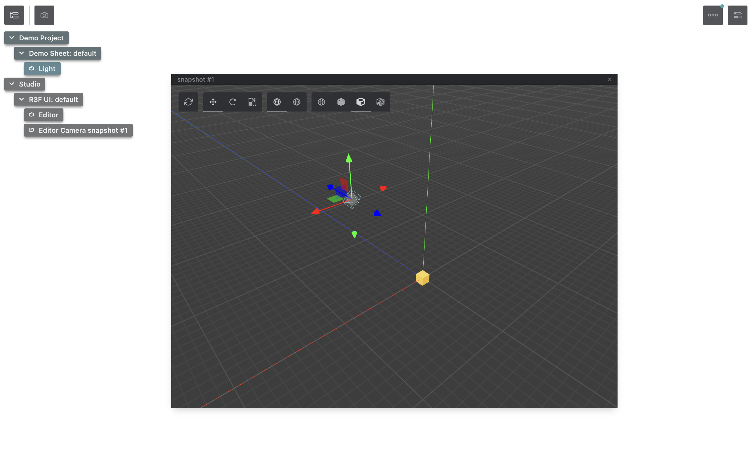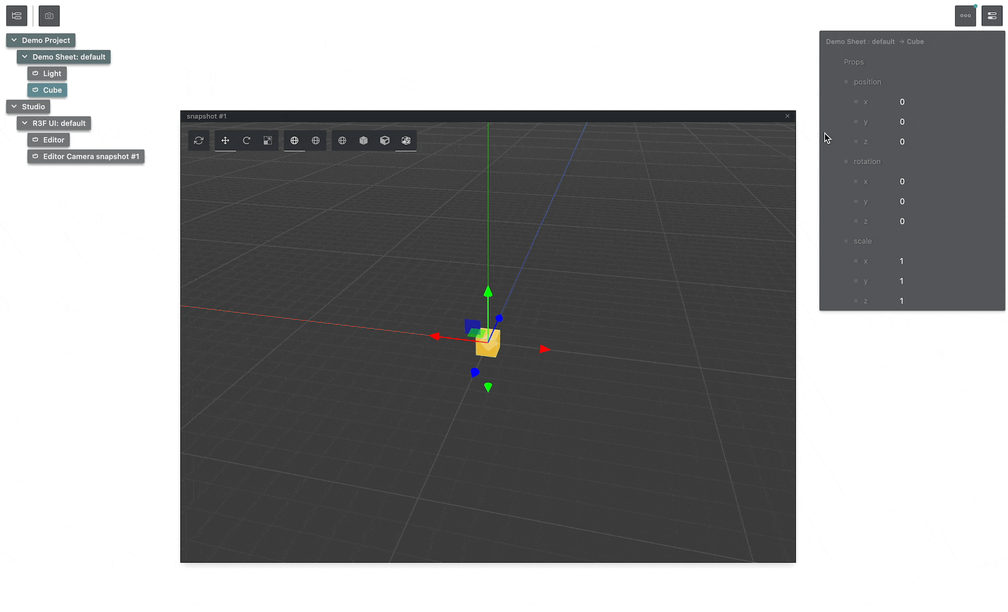 Now, our little yellow cube will show up in Theatre.js' r3f snapshot editor:
